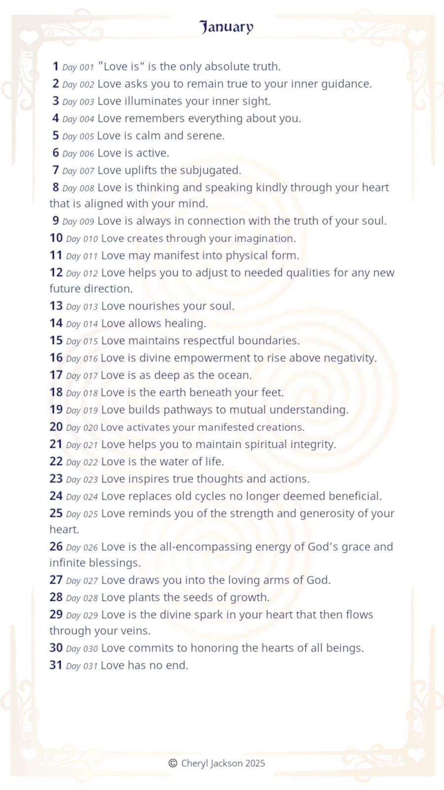 Each message starts with the word ‘love.’ If, as you read the message, that word seems oddly placed, remember that it may be a substitute for ‘God,’ The Angels,’ ‘Source,’ or the name of other very high vibrational beings. The intent is to broaden your perspective of love as more than an emotion.