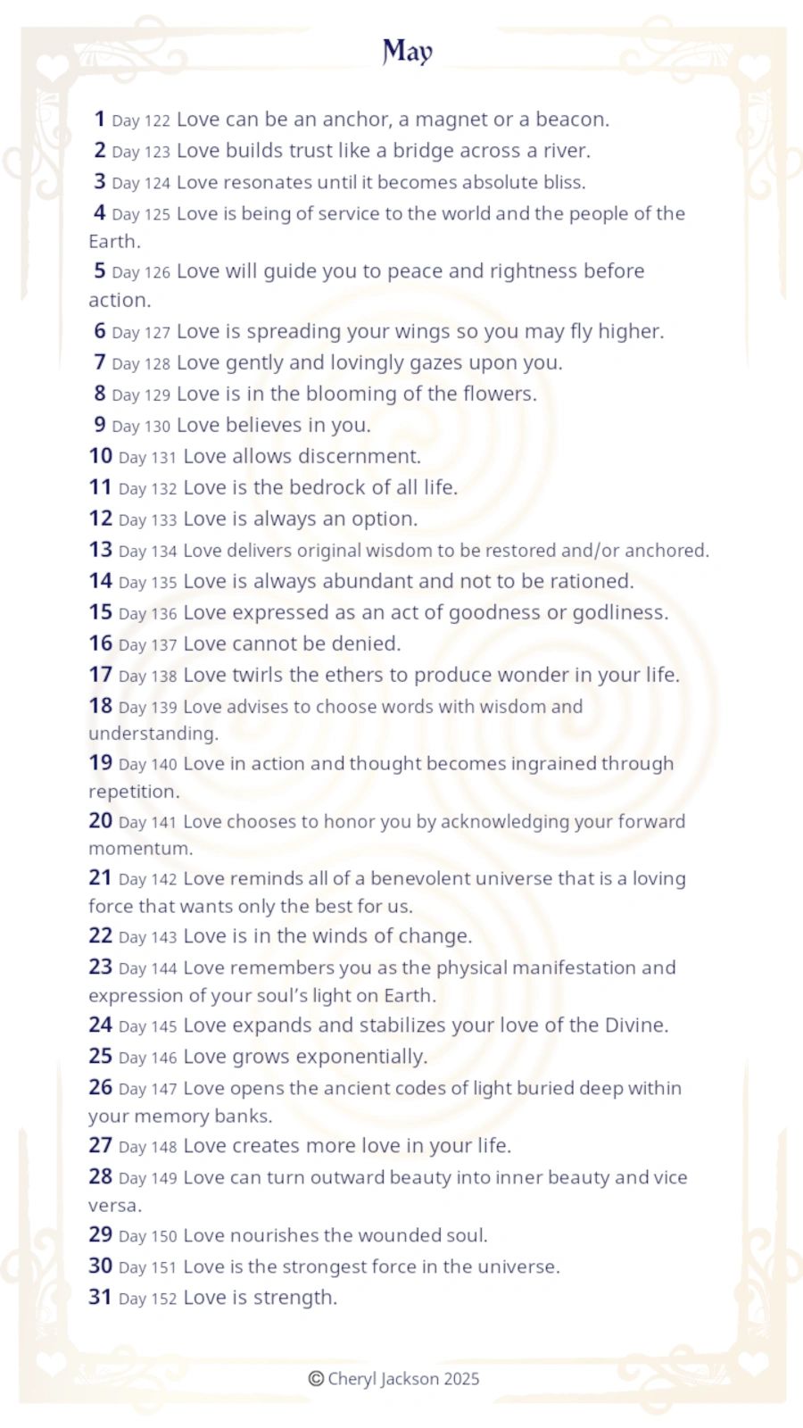 Each message starts with the word ‘love.’ If, as you read the message, that word seems oddly placed, remember that it may be a substitute for ‘God,’ The Angels,’ ‘Source,’ or the name of other very high vibrational beings. The intent is to broaden your perspective of love as more than an emotion.